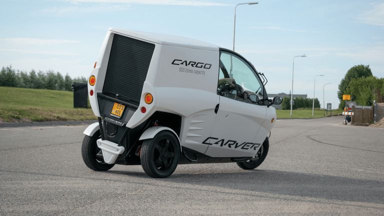 De Carver Cargo valt meteen op door zijn futuristische vorm en smalle bouw. Het voertuig is slechts één meter breed aan de voorkant en iets breder bij de laadruimte. Dankzij de driewielige constructie en gesloten cabine voelt het aan als een kruising tussen een scooter en een auto.